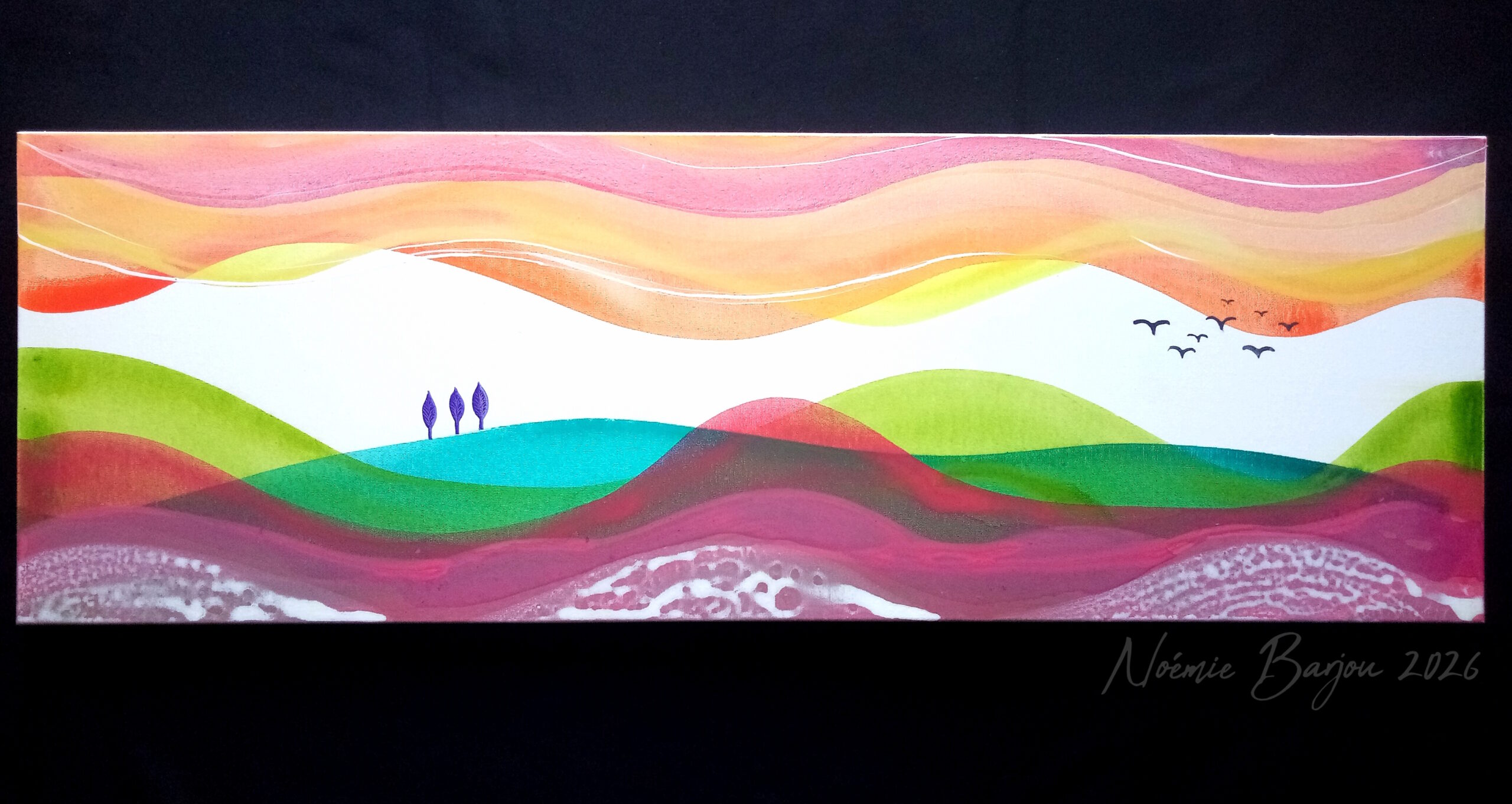 Retrouvez sur cette page tous mes tableaux sur toile classés par années. Cliquez sur une image pour l’agrandir. 2026 « Fulgurance », 50 x 50 cm, janvier 2026, 210 € « Mer de Nuages », 30 x 90 cm, février 2026, 310 € 2025 « Iloa Bleu & Rose », 30 x 90 cm, avril-mai 2025, 310 € « Les Entrailles de la Mer », 60 x 81 cm, mars 2025, 510 € « Lignes de Force », 60 x 81 cm, février 2025, 510 € « Iloa 2 », 20 x 60 cm (triptyque), février 2025, 120 € « Continent », 65 x 81 cm, juin 2025, 510€ « Territoire », 50×70 cm, juin 2025, 410€ 2024 « Archipel », 30 x 60 cm, décembre 2024, indisponible. « Pallas Athena », 60×80 cm, novembre 2024, 510€ « Jour d’Orage », 50×50 cm, novembre 2024, 210€ « D’un Monde à l’Autre », 70×70 cm, octobre 2024, 410€ « Adhara », 60×80 cm, septembre 2024, 510€ « Dilution », 55×46 cm, juin 2024, 250€ « Rêve de Matière 2 », 60 x 81 cm, juin 2024, 510€ « Voyage », 30×30 cm, mai 2024, 85€ « Exploration », 40×40 cm, avril 2024, 160€ « Rencontre », 50×61 cm, mars 2024, VENDU « Ancrage », 54×65 cm, mars 2024, 310€ « Miroir », 54×65 cm, mars 2024, 310€ « Réveil »,30×30 cm, mars 2024, 85€ « Rêve de Matière », 54×65 cm, février 2024, 310€ « Les Mondes de Neptune », 54×65 cm, février 2024, 310€ « Sommeil paradoxal », 50×70 cm, janvier 2024, 410€ « Mirage », 20×30 cm, janvier 2024, 70€ « Horizon des Evènements », 30×60 cm, janvier 2024, 250€ 2023 « Rock Rose », 60 x 60 cm, octobre 2023, 310 € « Trouver un Trésor », 81×60 cm, mai 2023, 510€ Lignes de Temps, 65×54 cm, mars 2023, 350€ « Epiphanie », 40×40 cm, mars 2023, 160€ « Abysses », 54×65 cm, février 2023, 310€ « Perspectives », 54×65 cm, janvier 2023, 310€ 2022 « Métamorphose », 50x61cm, novembre 2022, VENDU « Mondes intérieurs », 73×54 cm, octobre 2022, 410€ « Apparence » 30×90 cm juillet 2022 310€ « Décorum », 30×30 cm, juillet 2022, 85€ « Nostalgie », 30×90 cm, juin 2022, 310€ « Révélation », 50×61 cm, mai 2022, 250€ « Miracle », 73×60 cm, avril 2022, VENDU « Aquarius » 54x65cm, avril 2022, 310€ « Aries », 54x65cm, avril 2022, 310€ « Mystère de l’Unité », 35x27cm, mars 2022, 110€ « Abondance », 50×73 cm, mars 2022, 410€ « Cascade », 40×40 cm, février 2022 VENDU « Espace-Temps », 65×54 cm, février 2022, 310€ « Papel », 30×30 cm, février 2022, 85€ « Océan », 60×60 cm, janvier 2022, 310€ 2021 « Hauméa », 60x81cm, novembre 2021, 510€ « Sedna », 60x60cm, novembre 2021, 310€ « Monde minéral », 38x55cm, novembre 2021, 160€ « Le jour se lève », 61×50 cm, octobre 2021, VENDU « L’Or du soir », 40×40 cm, octobre 2021, VENDU « Les Roseaux », 30×30 cm, septembre 2021, VENDU « Orient », 30×30 cm, septembre 2021, 85 € « Mircéa », 54×65 cm, juin 2021, VENDU « Bellatrix », 50×61 cm, mai 2021, 250€ « Transcendance » 50×50 cm, mai 2021, 210€ « Iloa », 30×30 cm 3D, avril 2021, 90€ « L’Écume des choses », 30×60 cm, avril 2021, 250€ « Providence », 40×40 cm, mars 2021, VENDU « Monde Lointain », 50×50 cm, mars 2021, VENDU « Alpha du Centaure », 65×54 cm, mars 2021, VENDU « Spain » 30×30 cm, 2021, 85€ 2020 « Envol », 30×90 cm, 2020, VENDU « Identité Protéiforme », 110×80 cm, 2009-2020, 750€ « Hélios », 54×65 cm, 2020, 310€ « Bryonia », 38×46 cm, 2020, 160€ -50% = 80€ « Andrographis », 65×46 cm, 2020, 310€ -30% = 217€ « Callisto », 40×40 cm, 2020, 160€. « Andromède », 50×61 cm, 2020, 250€ « Seth », 50×61 cm, 2020, 250€ « La Voie », 30×40 cm, 2020, 100€ -50% = 50€ « L’éclair », 46×55 cm, 2020, 210€ « Marina 2 », 30×30 cm, 2017-2020, 85€ « Libra », 50×61 cm, 2020, 250€ « Lydia », 33×46 cm, 2020, 120€ « Chelsea », 30×30 cm, 2020, 85€ « Lumières de l’univers », 65×54 cm, 2020, VENDU « Eskaton », 30×30 cm, 2020, 85€ -20% = 68€ 2019 « Fantaisie », 30x40cm, 2019. 90€ « Thémis », 30×30 cm, 2019, 75€ « Tempérance », 40x40cm, 2019, VENDU « Pallas », 50×50 cm, 2019. 200€ -50% = 100€ « 7h90 » 46×55 cm, 2016-2019. 200€ « Jésus », 50×70 cm, 2015-2019, 410€ « Electra » 49,5×70 cm, 2009-2019, 410€ « Lilith », 24×30 cm, 2019. 60€ « Eris », 40×50 cm, 2019. 150€ -50% = 75€ « Etoile Rouge », 54×65 cm, 2012-2019. 200€ -50%= 100€ « Jardin Nocturne », 30×30 cm, 2019, 85€ « Iloé », 30×30 cm, 2019, 75€ « Duly », 40×40 cm, 2019. 120€ -50% = 60€ Années antérieures « Céphéüs », 60×81 cm, novembre 2018, indisponible. « Marina », 46×55 cm, 2017. 210€ -50% = 105€ « Régate », 38×46 cm, 2016. 160€ -50% = 80€ « Labyrinthe », 50×70 cm, 2014 « L’Arbre des mystères », 50×70 cm, 2012 « Jardin d’enfant », 20×20 cm, 2010, 75€